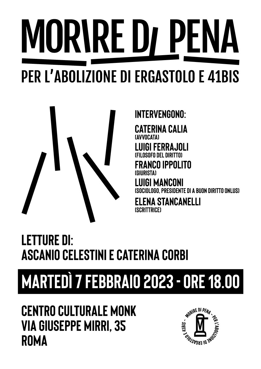 Si svolgerà il 7 febbraio a Roma la prima iniziativa pubblica organizzata dalla piattaforma MORIRE DI PENA. PER L’ABOLIZIONE DI ERGASTOLO E 41BIS, dopo la diffusione di un documento on-line che ha raccolto più di cinquecento adesioni individuali e quasi trecento sottoscrizioni tra gruppi, associazioni e collettivi, . A promuovere l’incontro una rete di realtà impegnate nel mondo della cultura e nella tutela dei diritti, sindacati di base, avvocati, attivisti e addetti ai lavori dell’universo penitenziario.